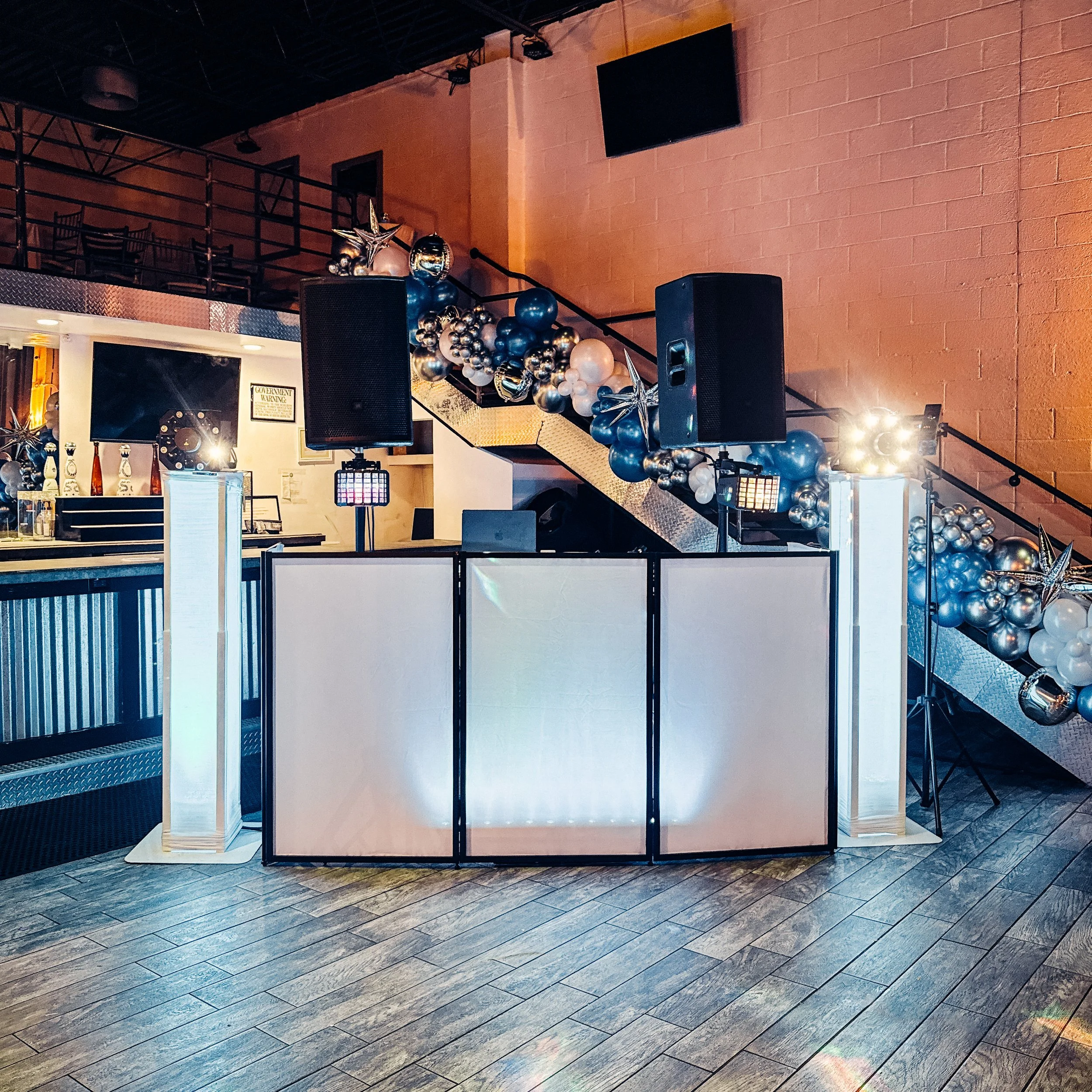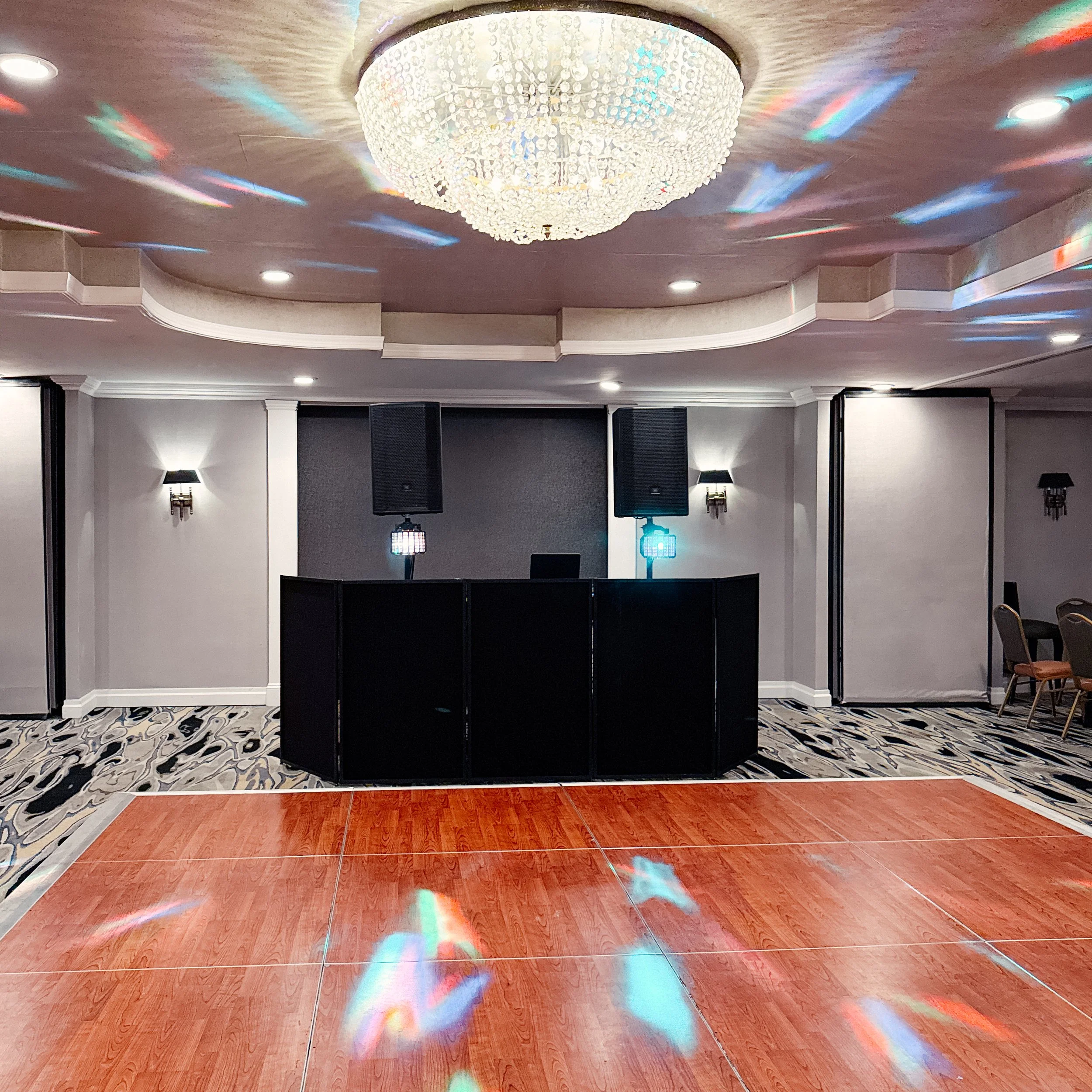 A clean, all-black setup designed for more intimate celebrations, with sound-active dancefloor lighting to create a lively atmosphere